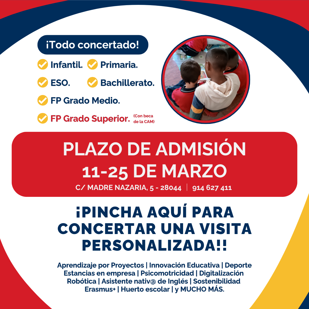 Centro Educativo de Educación Infantil, Educación Primaria, Educación Secundaria, Bachillerato, Ciclos Formativos de Grado Medio y Grado Superior, inspirado en nuestra filosofía de centro cristiano cuyo objetivo principal es la formación integral de la persona de acuerdo con los principios y visión humana y cristiana de la vida, acompañando y fomentando todos los aspectos y dimensiones que la conforman.